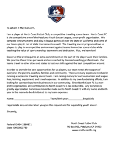 Sponsorships can be solicited by NCFC players. There are very specific rules that NCFC must follow in reporting these sponsorships, so that means specific rules for teams. NCFC must keep information on sponsorships and their amounts for club records. Also, anyone who donates in excess of $250 must receive an acknowledgement/receipt for tax purposes.